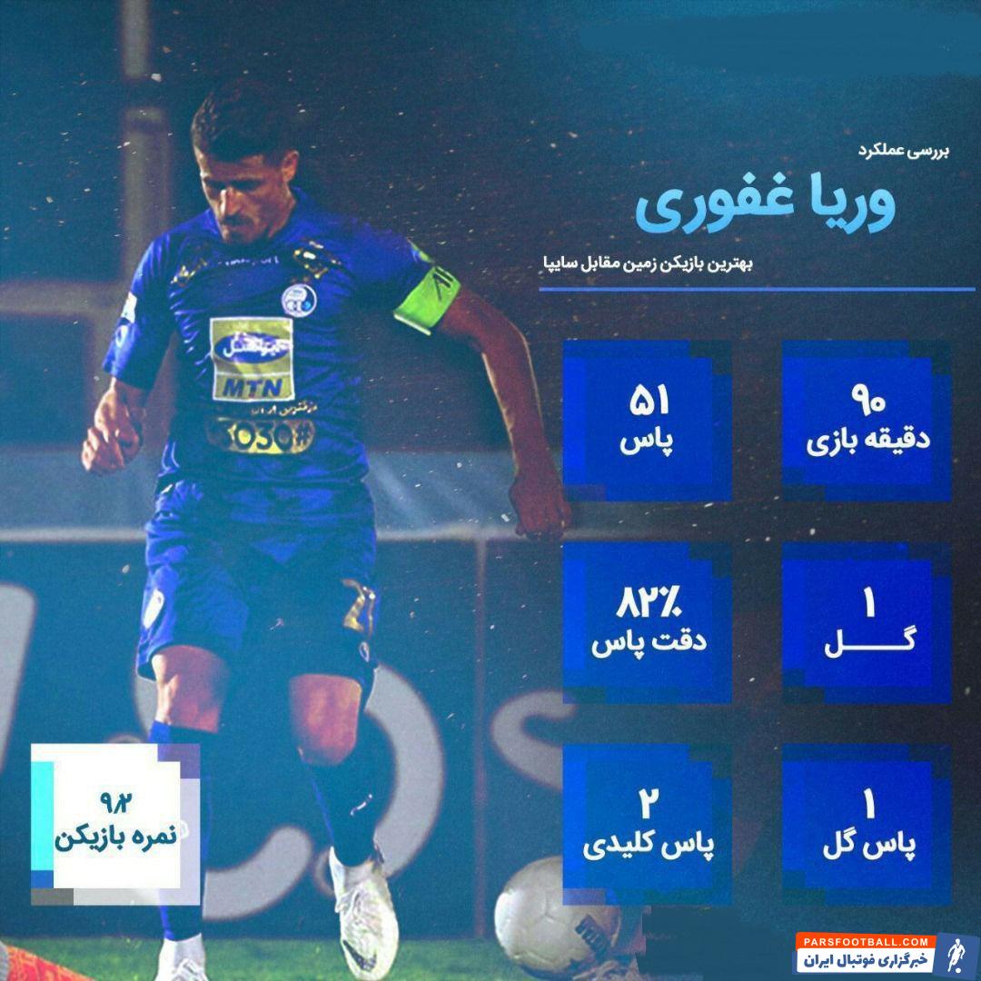 درخشش وریا تا اندازه ای جالب توجه بود که کارشناسان ما میانگین نمره ۹٫۲ را برای غفوری در نظر گرفتند تا از او به عنوان بهترین بازیکن جدال استقلال با سایپا نام برده شود. کاپیتان آبی ها در این بازی ۵۱ بار پاس داد که دقت پاس های صحیح او ۸۲% ثبت شد. یک بار موفق به گلزنی از روی نقطه پنالتی شد تا کابوس این ضربات هم برای استقلالی ها به پایان برسد .