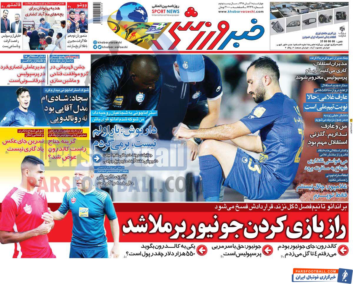 عناوین روزنامه خبر ورزشی جهارشنبه ۱ آبان ماه به شرح زیر است :
