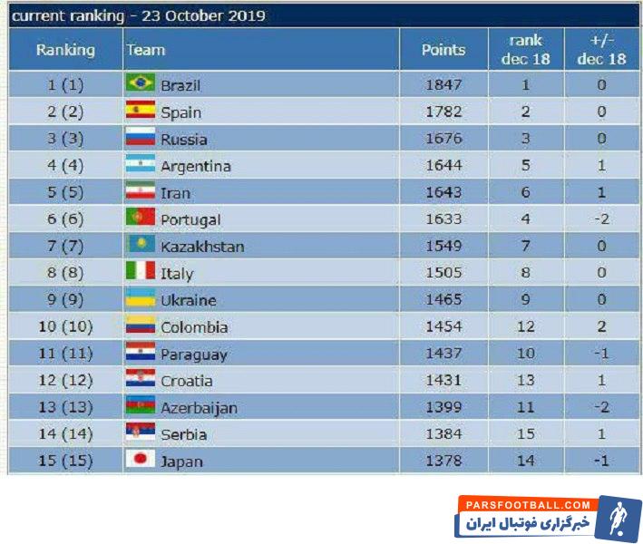 در تازه ترین رنکینگ اعلام شده از سوی فیفا تیم ملی فوتسال ایران هم چنان تیم اول آسیا بشمار می رود.