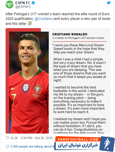 رونالدو خطاب به بازیکنان تیم زنان پرتغال نوشت: “من این کفش ها را برای شما ارسال کرده و امیدوارم به شما برای رسیدن به رویاهایتان کمک کند. وقتی بچه بودم، رویایی ساده اما دیوانه وار داشتم. نه، رویای من از آن آرزوهایی نبود که در خواب می بینید، بلکه رویایی بود که شما را در سراسر شب بیدار نگه می داشت.
