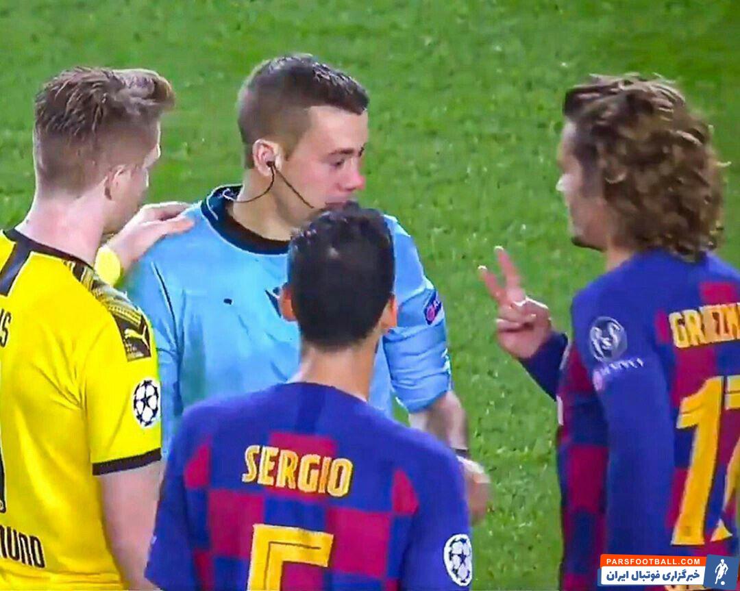 عکس ؛ اقدام گریزمان پس از اتفاق عجیب برای داور دیدار بارسلونا و دورتموند