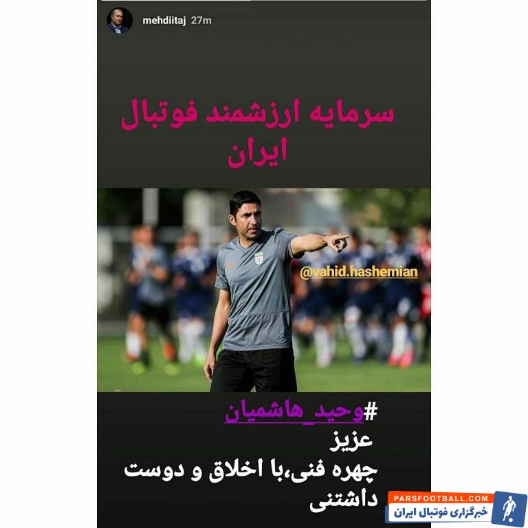 مهدی تاج با انتشار تصویری از وحید هاشمیان و نوشتن جملاتی درباره رفتار حرفه ای و فنی این بازیکن سابق تیم ملی که جزو باسابقه ترین بازیکنان ایران در لیگ آلمان محسوب می‌شود، از او به عنوان سرمایه فوتبال ایران نام برد. هاشمیان بعد از حضور مارک ویلموتس در فوتبال ایران و روی نیمکت تیم ملی، به عنوان دستیار کارش را در کنار این مربی بلژیکی دنبال کرده بود و اکنون باید دید منظور تاج از این استوری در این مقطع که شایعات درباره ویلموتس زیاد است، چه بوده.