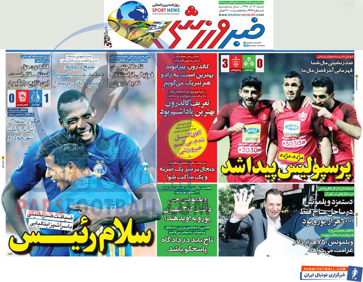 عناوین روزنامه خبر ورزشی شنبه ۱۶ آذر ماه به شرح زیر است :