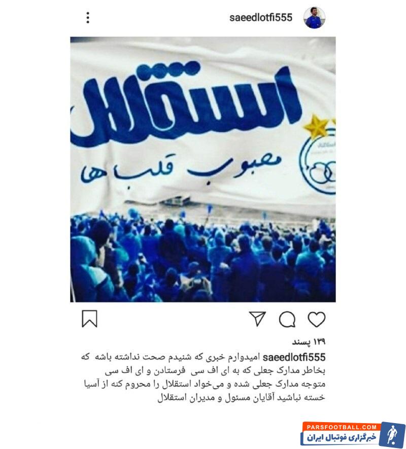 سعید لطفی ، مدافع پیشین استقلال با انتشار پیامی در اینستاگرام، در خصوص حذف آبی پوشان پایتخت از لیگ قهرمانان آسیا ابراز نگرانی کرد. او در این ارتباط نوشت: