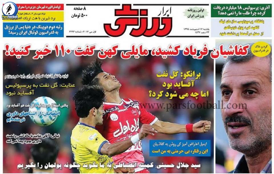 روزنامه ابرار ورزشی ۱۲ اردیبهشت |کفاشیان فریاد کشید ، مایلی کهن گفت ۱۱۰ خبر کنید ! | برانکو : گل نفت افساید بود اما چه می شود کرد؟