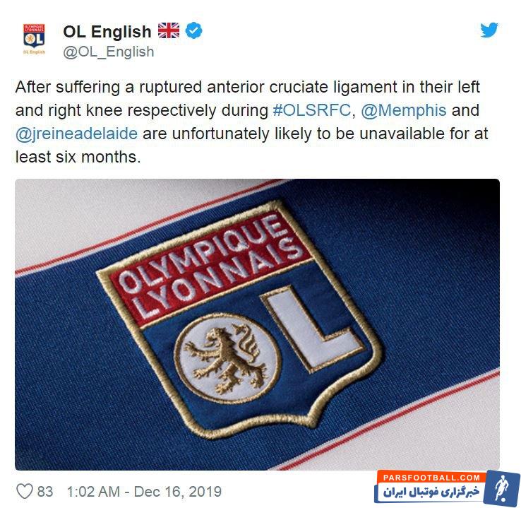 باشگاه لیون تایید کرد که کاپیتان هلندی این تیم، ممفیس دیپای، روز یکشنبه در جریان دیدار لیون و رن در لوشامپیونا از ناحیه رباط صلیبی زانوی چپش دچار پارگی شده است. به این ترتیب به احتمال قریب به یقین، دیپای ادامه فصل باشگاهی را از دست خواهد داد و حتی به احتمال زیاد نخواهد توانست در تابستان آینده با پیراهن تیم ملی هلند در رقابتهای یورو۲۰۲۰ به میدان برود.