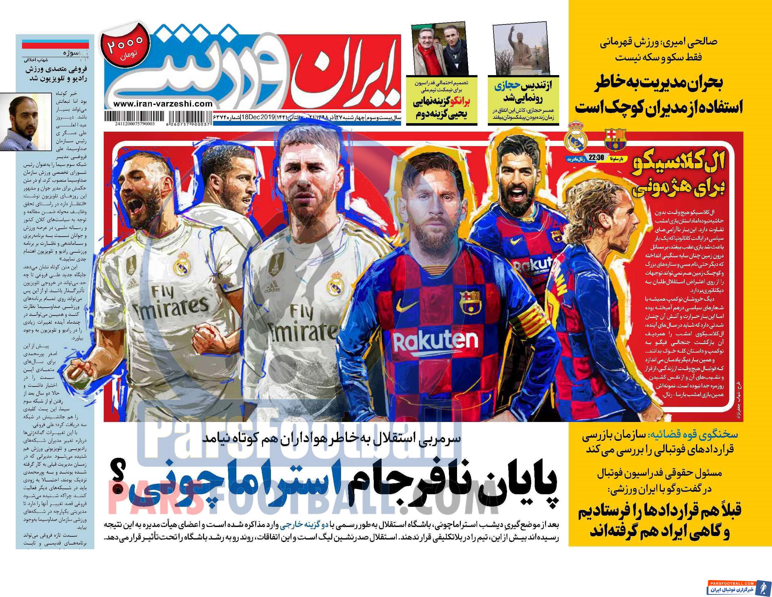 عناوین روزنامه ایران ورزشی چهارشنبه ۲۷ آذر ماه به شرح زیر است :