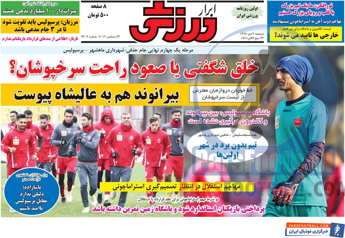 عناوین روزنامه ابرار ورزشی دوشنبه ۲ دی ماه به شرح زیر است :