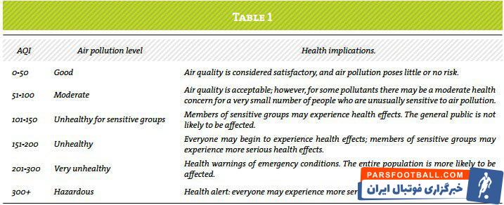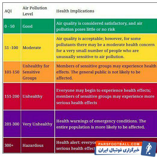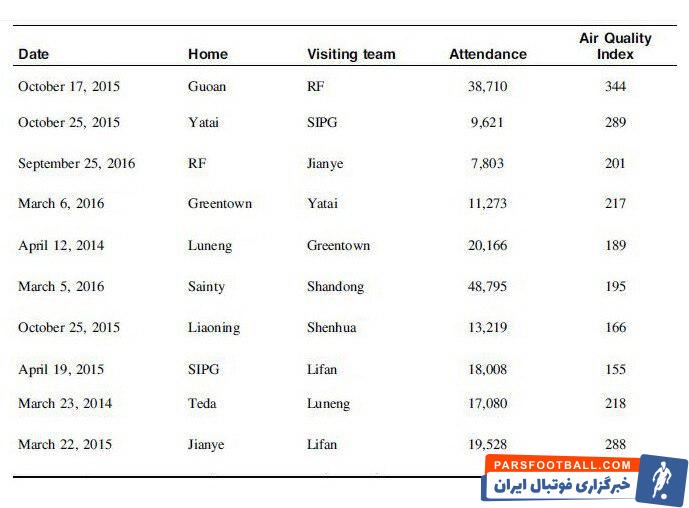 عکس اول توصیه سازمان بهداشت جهانی برای فعالیت ها بر اساس شاخص کیفیت هواس (AQI). در واقع در شاخص های بیشتر از ۱۵۰ احتیاط لازم برای فعالیت در محیط باز توصیه شده و برای شاخص بیشتر از ۲۰۰ خودداری از هرگونه فعالیت در محیط پیشنهاد شده. اما این دیدگاه فقط توصیه ای است که در موارد بسیاری نادیده گرفته می‌شود. برای نمونه از سال ۲۰۱۴ الی ۲۰۱۶ در سوپرلیگ فوتبال چین 10 مسابقه در شاخص بیشتر از ۱۵۰ و ۶ مسابقه در شاخص بیشتر از ۲۰۰ انجام شده (عکس دوم). در اکتبر ۲۰۱۵ مسابقه بین دو تیم بیجینگ گوان و گوانگ ژو آر اف در شهر پکن با حضور ۳۸۰۰۰ تماشاگر و در شاخص کیفیت هوای ۳۴۴ برگزار شد!!! برگزاری یک بازی در شرایط محیطی بسیار خطرناک با شاخص بیشتر از ۳۰۰.