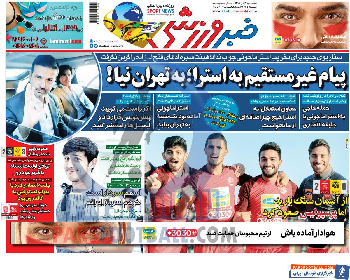 عناوین روزنامه خبر ورزشی سه شنبه ۳ دی ماه به شرح زیر است :