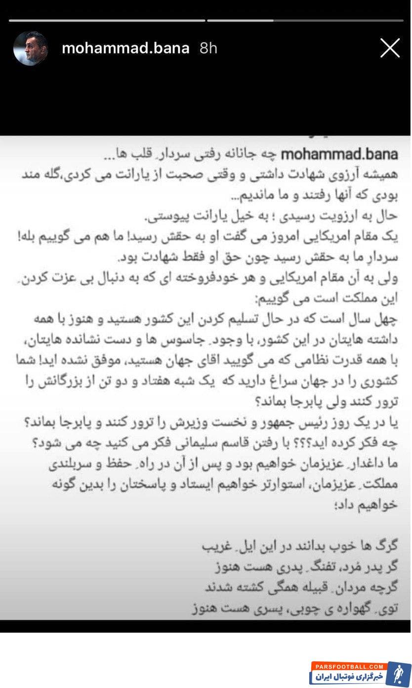 دلنوشته خواندنی محمد بنا در واکنش به شهادت سپهبد سردار قاسم سلیمانی + سند