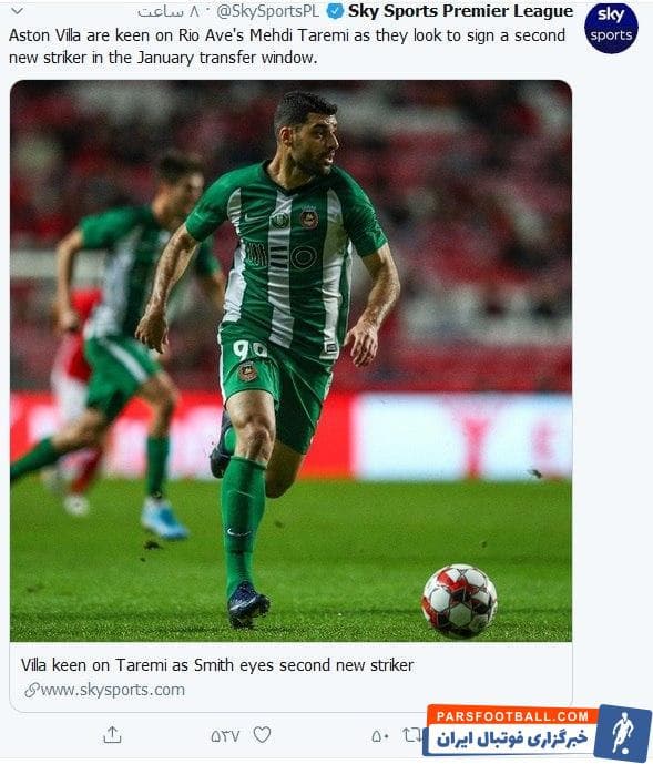 به نقل از اسکای اسپورتس، باشگاه استون ویلا در لیگ برتر انگلیس قصد دارد مهدی طارمی ، بازیکن ایرانی ریو آوه را در نقل و انتقالات ژانویه (نیم فصل) به عنوان دومین مهاجم جدید به خدمت بگیرد.