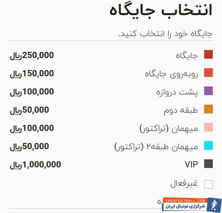 بنابراین بلیت VIP با بهای ۱۰۰ هزار تومان، قسمت جایگاه ۲۵ هزار تومان، روبروی جایگاه ۱۵ هزار تومان و پشت دروازه ۱۰ هزار تومان خواهد بود. همچنین تمام صندلی های طبقه دوم با بهای ۵ هزار تومان به فروش خواهد رفت.