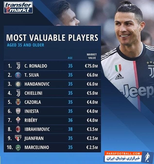 به بهانه سالروز تولد کریس رونالدو ، فهرستی از ارزشمندترین بازیکنان ۳۵ ساله به بالا حال حاضر فوتبال جهان منتشر شده است.