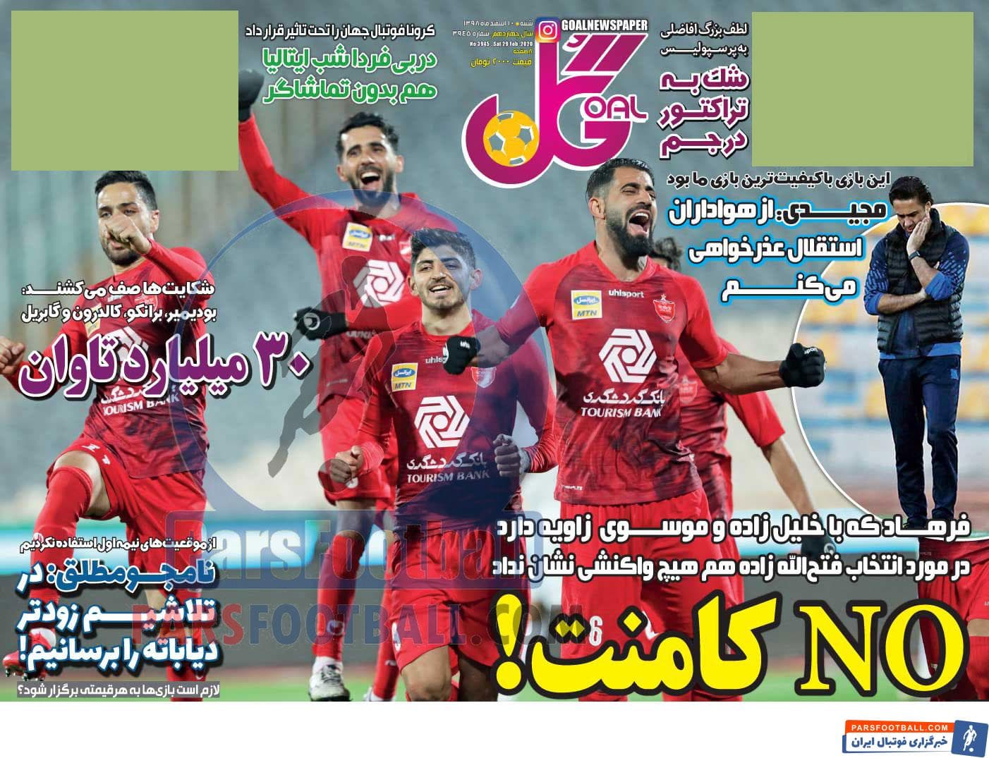 عناوین روزنامه گل شنبه ۱۰ اسفند ماه به شرح زیر است :