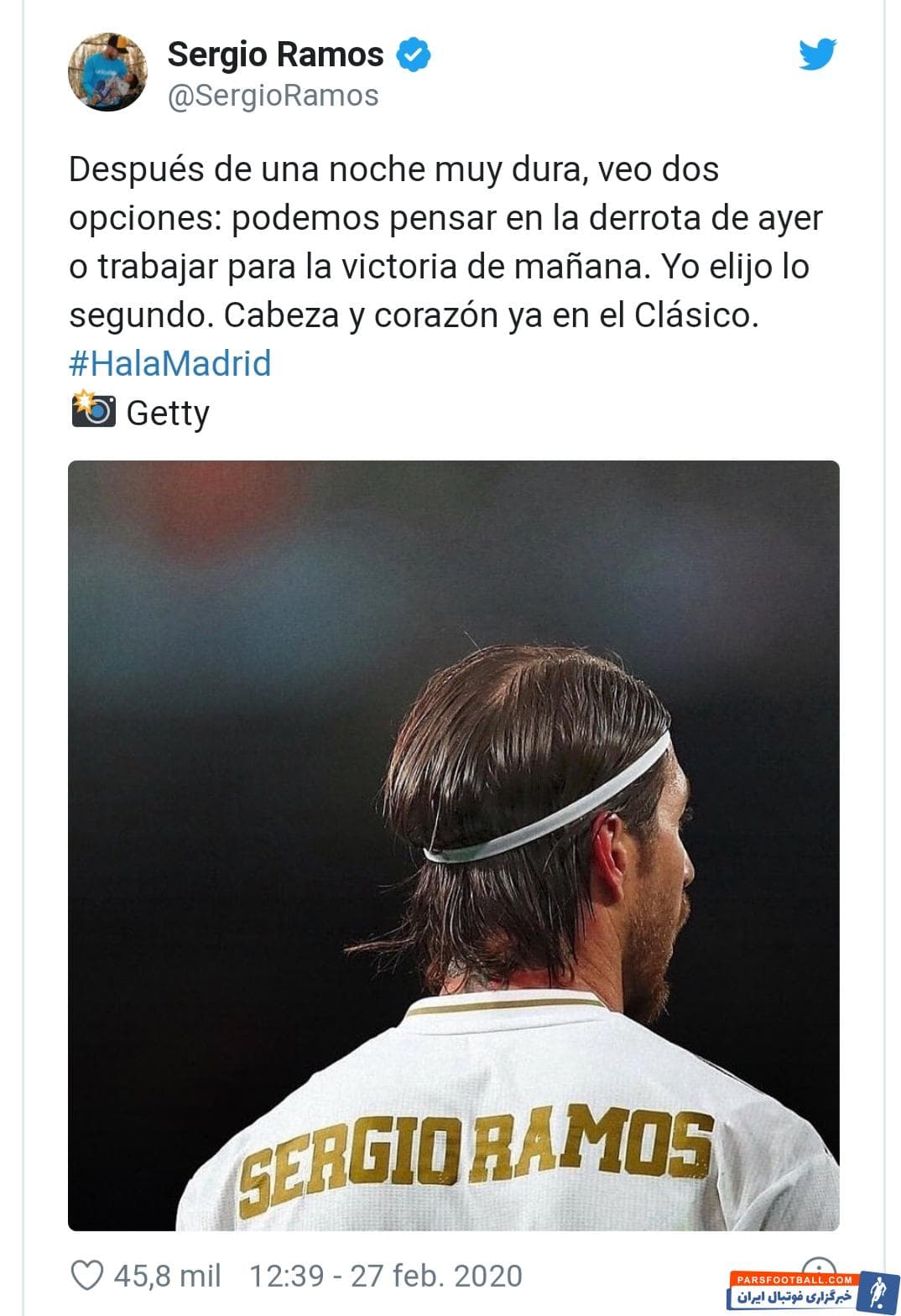 چهار شنبه شب رئال مادرید در چهارچوب مرحله یک هشتم نهایی لیگ قهرمانان اروپا در ورزشگاه سانتیاگو برنابئو میزبان منچسترسیتی بود و در حالی که تا ۱۰ دقیقه مانده به پایان بازی با یک گل از حریف خود پیش بود، در نهایت دو گل دریافت کرد تا علاوه بر تجربه یک شکست تلخ، کار برای صعود کهکشانی ها به مرحله بعد نیز بسیار دشوار شود. کاپیتان رئال مادرید یعنی سرخیو راموس که در دقایق پایانی دیدار برابر منچستر سیتی با کارت قرمز داور مواجه شد، در توییتر خود واکنش جالبی نسبت به شکست تلخ برابر سیتی نشان داد.