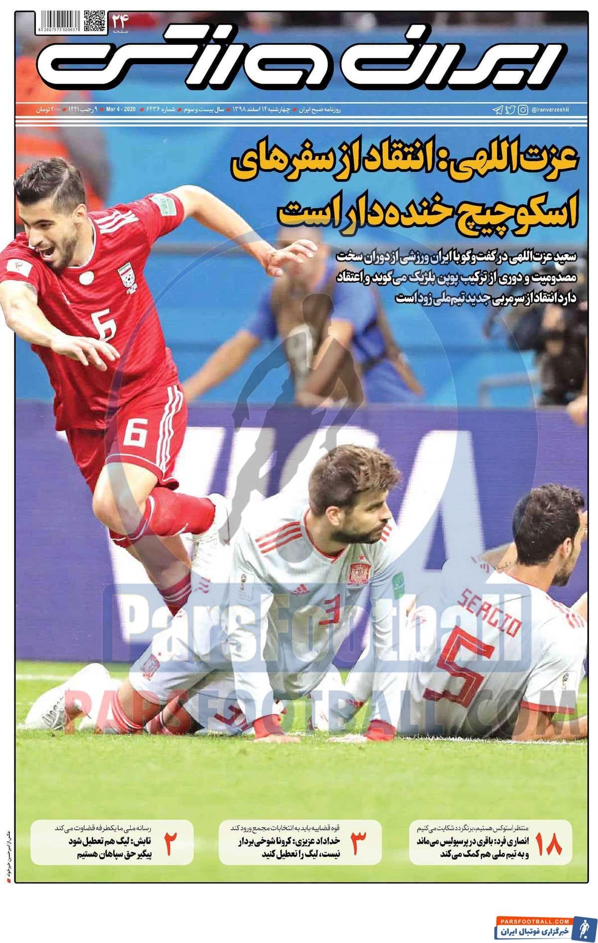 عناوین روزنامه ایران ورزشی چهارشنبه ۱۴ اسفند ماه به شرح زیر است :
