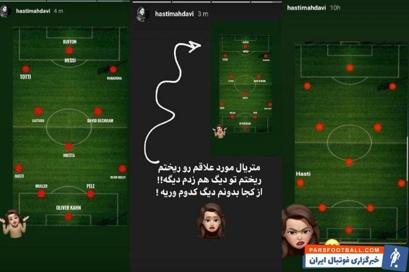 هستی مهدوی فر که پیش تر هم با انتشار عکسی از خودش و فرانچسکو توتی در فضای مجازی نشان داده بود تا چه اندازه به فوتبال علاقه مند است شب گذشته در حساب خود در اینستاگرام تیم رویاییاش را انتخاب کرد.