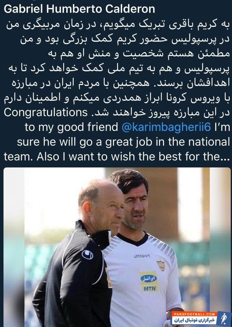 گابریل کالدرون انتخاب کریم باقری را به عنوان مربی تیم ملی فوتبال تبریک گفت.