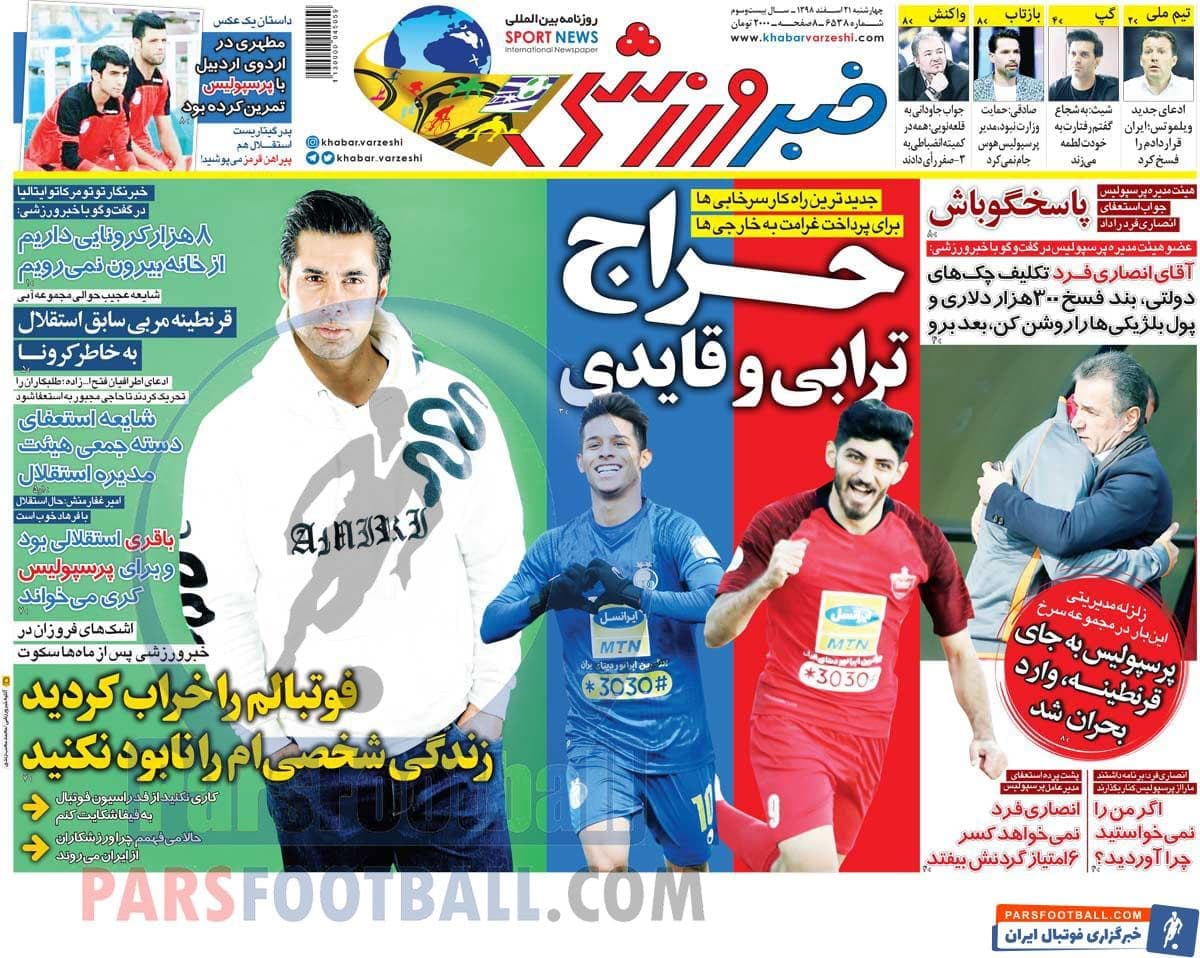 عناوین روزنامه خبر ورزشی چهارشنبه ۲۱ اسفند ماه به شرح زیر است :