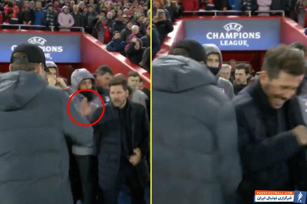 اما دیگو سیمئونه که به نظر حواسش به این پروتکل بهداشتی نبود، ابتدا دستش را به سمت یورگن کلوپ دراز کرد و بعد که متوجه شد سرمربی حریف چنین تصمیمی داره، خواسته او را اجابت کرده و به سبک جدید خوش و بش کرد. اما در ادامه دیگو سیمئونه، یورگن کلوپ را به شوخی بغل کرده و در آغوش او خندید تا اینگونه نگرانی های موجود در مورد ویروس کرونا را به سخره بگیرد.