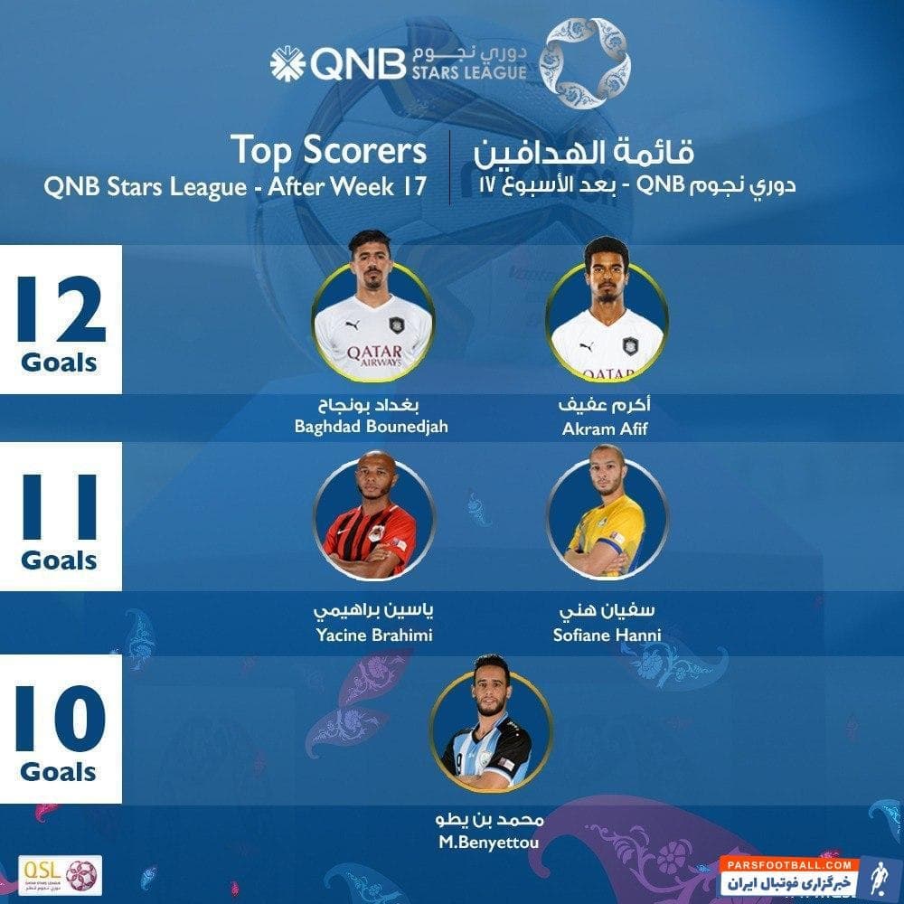 اکرم عفیف به همراه بغداد بونجاح با به ثمررساندن ۱۲ گل تا به اینجای رقابت ها صدرنشین برترین گلزنان بودند که این دو نفر را یاسین براهیمی ستاره الریان و سفیان هنی از الغرافه با ۱۱ گل تعقیب می کنند تا جنگ چهارگانه برای آقای گلی همه نگاه ها را به خود جلب کند. محمد بن یطو از المرخیه نیز با ۱۰ گل شانس خوبی برای حضور در این کورس دارد.