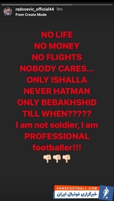 بوژیدار رادوشویچ، دروازه بان کروات پرسپولیس که این فصل هر بار درون دروازه ایستاده عملکرد خوبی داشته، دقایقی پیش یک استوری در اینستاگرام خود منتشر و به شدت نسبت به عملکرد مدیران باشگاه انتقاد کرد.