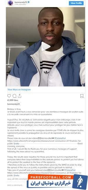 بنجامین مندی ستاره فرانسوی منچسترسیتی که در قرنطینه خانگی به سر میبرد میگوید تست کرونای اعضای خانوادهاش منفی بوده است.