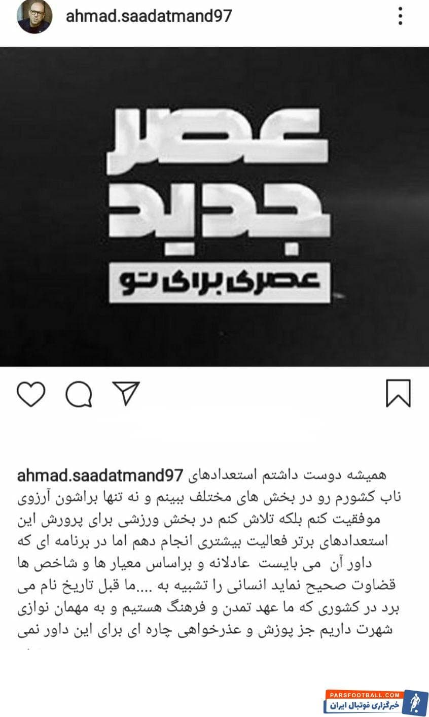 درخواست اینستاگرامی احمد سعادتمند از داور عصر جدید: عذرخواهی کن