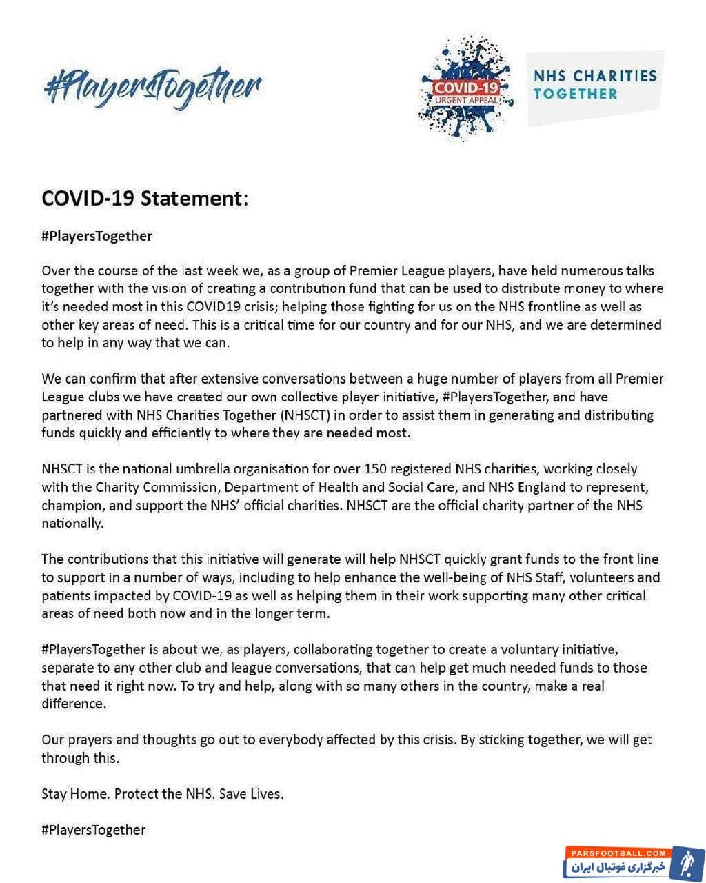 تمامی بازیکنان شاغل در لیگ برتر انگلیس مبلغی را برای مقابله با ویروس کرونا به NHS اهدا کردند
