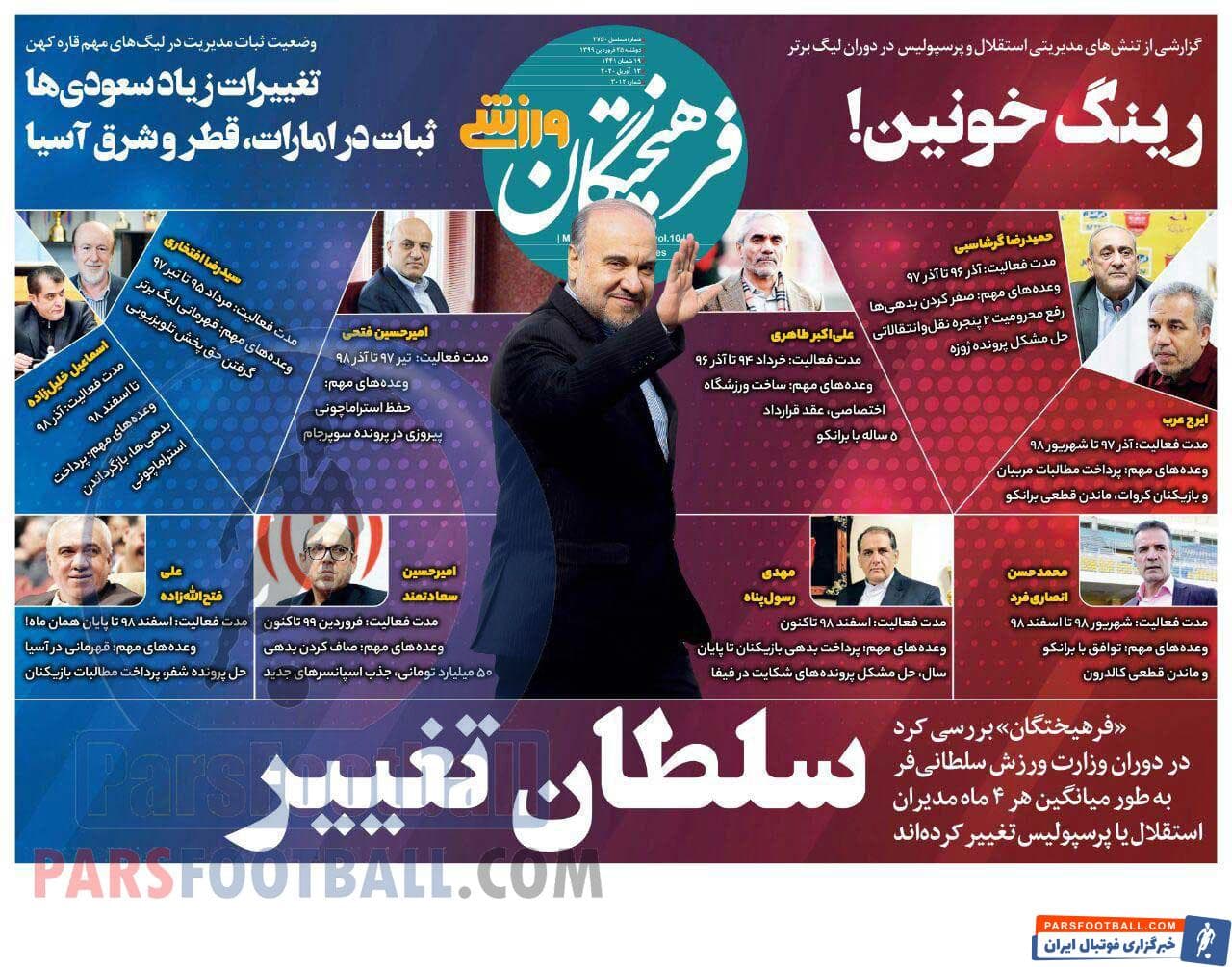 عناوین روزنامه فرهیختگان ورزشی دوشنبه ۲۵ فروردین ماه به شرح زیر است :