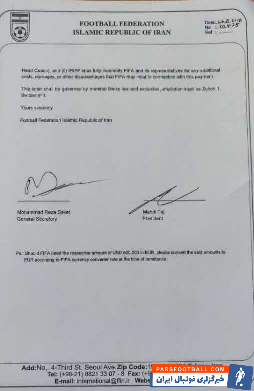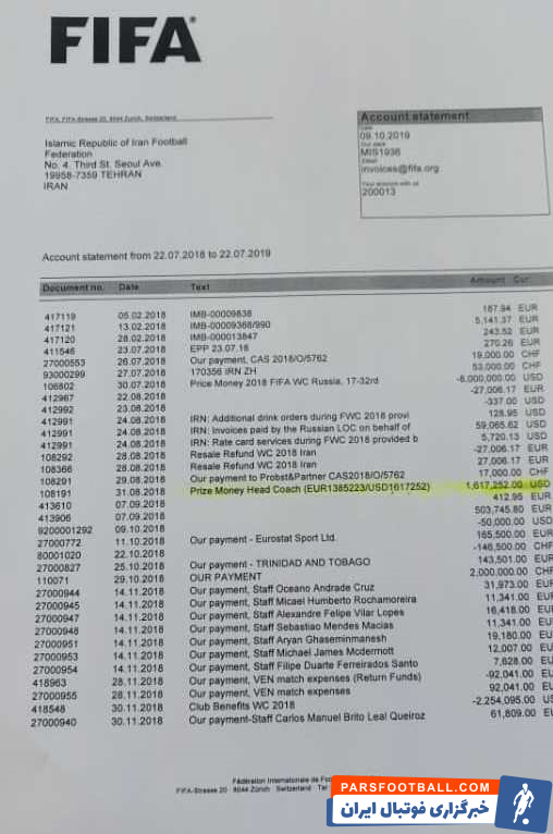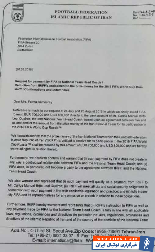 طی نامه مورخ ۲۶ آگوست ۲۰۱۸ درخواست پرداخت مبلغ ۸۰۰ هزار دلار (بابت پاداش صعود به جام جهانی ۲۰۱۸ – روسیه براساس قرارداد منعقد شده و با تاخیر پرداخت یکساله) به همراه دو قسط آخر حق الزحمه کی روش به مبلغ ۷۰۰ هزار یورو ( با تاخیر پرداخت ۶ ماهه) که مجموع آن با تبدیل مبلغ یورو به دلار جمع به مبلغ یک میلیون و ششصد و هفده هزار و دویست و پنجاه و دو دلار که از سوی فیفا از حساب فی مابین کسر و به حساب کارلوس کی روش واریز شده است.