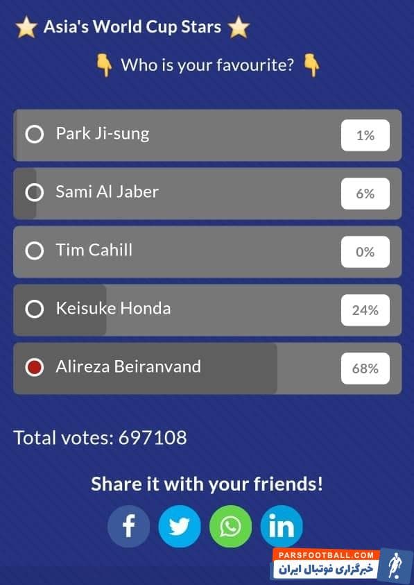 بیرانوند که ۶۸ درصد آراء را به خودش اختصاص داد، بالاتر از کیوسکه هوندا ژاپنی، سامی الجابر عربستانی، تیم کیهیل استرالیایی و پارک جی سونگ کرهای قرار گرفت.