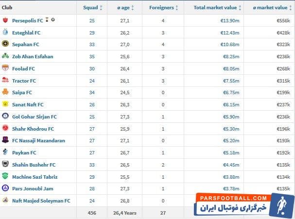 در این جدول، ارزشمندترین تیم با ۱۳.۹ میلیون یورو متعلق به پرسپولیس است که چندین بازیکن آن در بین ۱۰ بازیکن ارزشمند لیگ برتر قرار گرفته‌اند. پس از آنها، استقلال با ۱۲.۴۳ میلیون یورو دیده می‌شود که در جدول رده بندی لیگ برتر با یک بازی کمتر در رده چهارم قرار دارد.