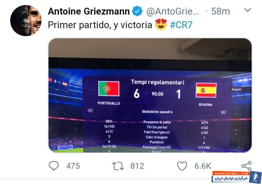 جنجال تازه ی آنتوان گریزمان با انتشار پستی پس از پیروزی پرگلش در بازی PES 2020 و تشکرش از رونالدو