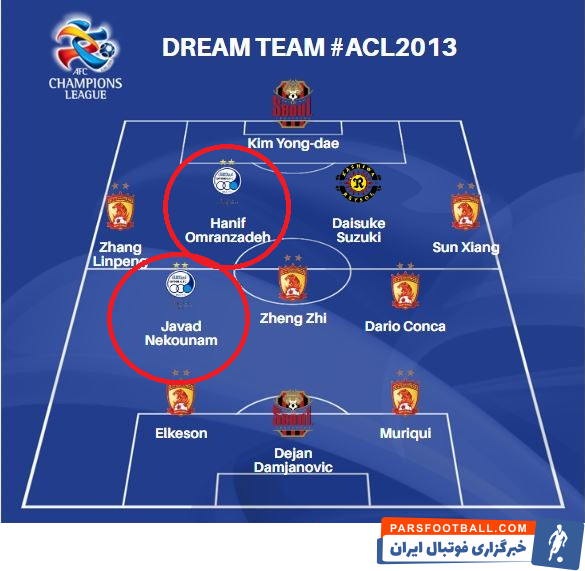 در تیم منتخب لیگ قهرمانان آسیا ۲۰۱۳ نام جواد نکونام و حنیف عمرانزاده، ۲ بازیکن سابق استقلال دیده میشود.