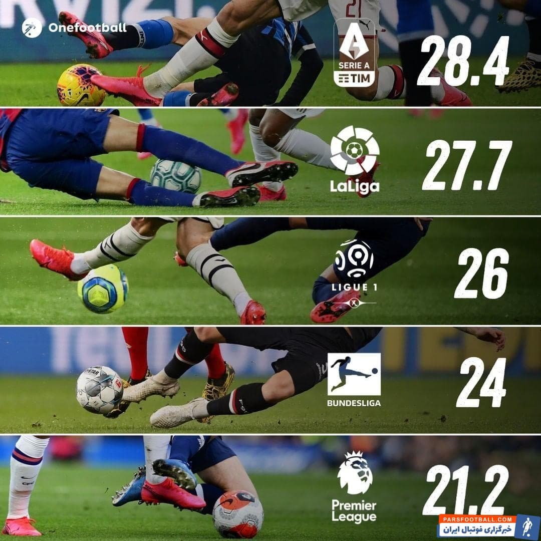 فهرستی از میانگین میزان خطا در میان ۵ لیگ معتبر اروپایی منتشر شده است که لیگ ایتالیا (سری آ) با میانگین خطای ۲۸.۴ بیشترین برخورد را در لیگهای معتبر قاره سبز دارد.