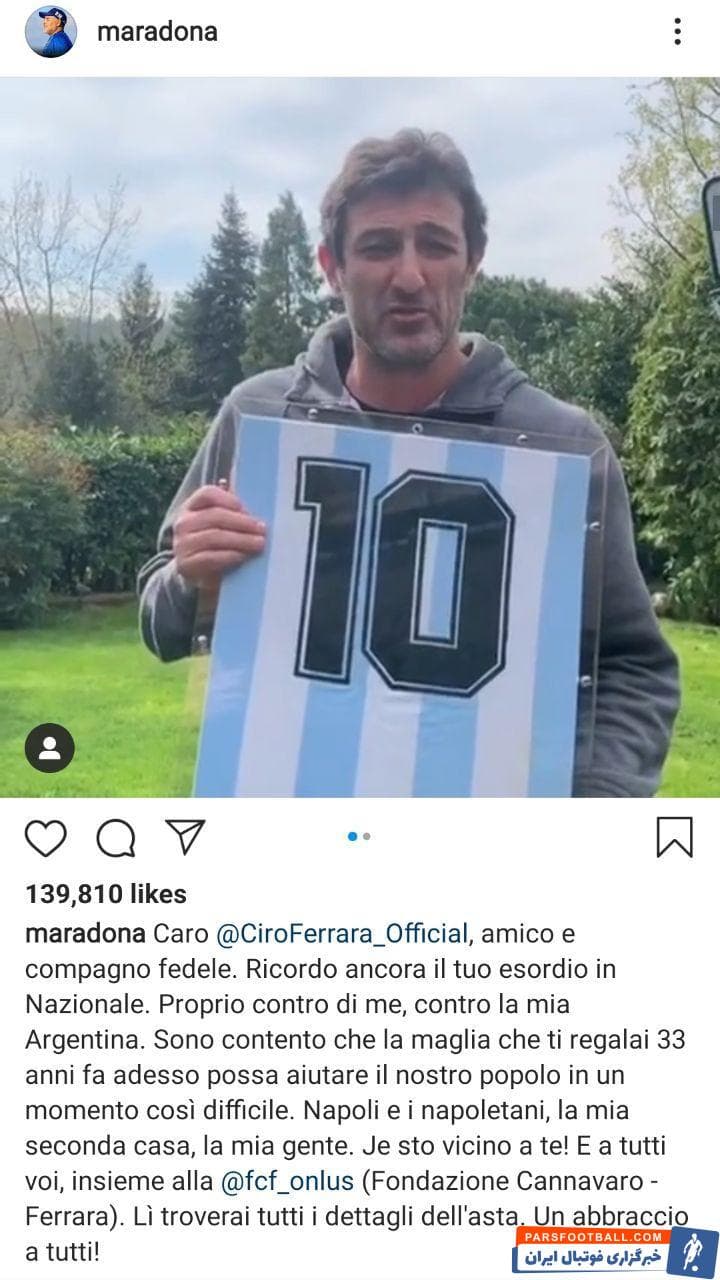 دیگو مارادونا اسطوره فوتبال آرژانتین، از چیرو فرارا، هم تیمی سابقش در ناپولی، به دلیل فروش پیراهن به قیمت ۵۵ هزار یورو برای کمک به مبارزه با کرونا در ناپل، تشکر کرد.