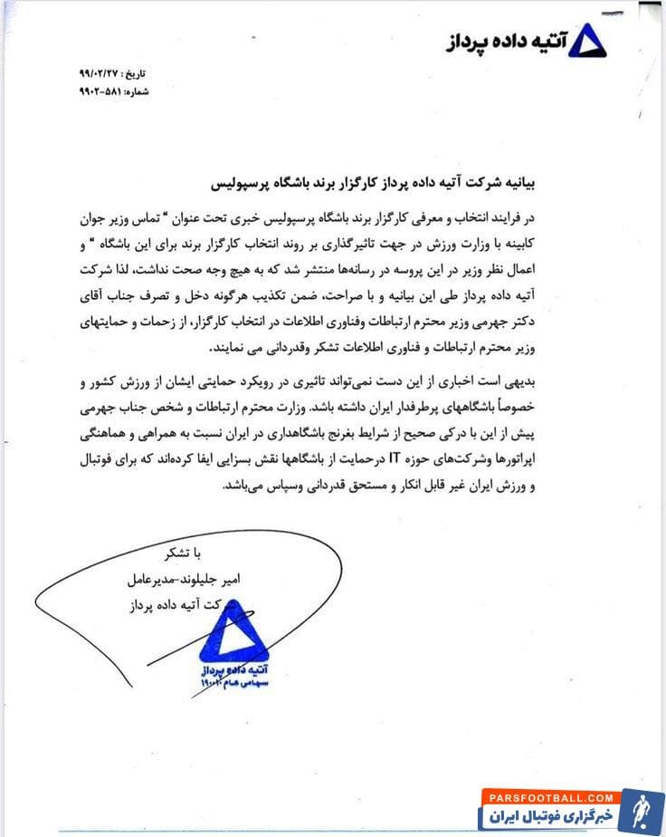 بدیهی است اخباری از این دست نمی‌تواند تاثیری در رویکرد حمایتی ایشان از ورزش کشور و خصوصاً باشگاههای پرطرفدار ایران داشته باشد. وزارت محترم ارتباطات و شخص جناب جهرمی پیش از این با درکی صحیح از شرایط بغرنج باشگاهداری در ایران نسبت به همراهی و هماهنگی اپراتورها وشرکت‌های حوزه IT درحمایت از باشگاهها نقش بسزایی ایفا کرده‌اند که برای فوتبال و ورزش ایران غیر قابل انکار و مستحق قدردانی و سپاس می‌باشد.»