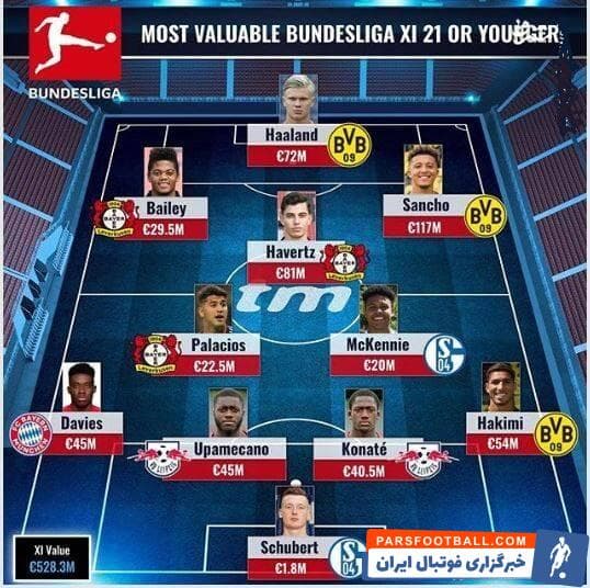 ترانسفرمارکت تیمی منتخب از بازیکنان جوان و بااستعدادی که در بوندسلیگا توپ می‌زنند، منتشر کرد ارزش این تیم در حدود ۵۲۸ میلیون یورو ارزیابی شده است.