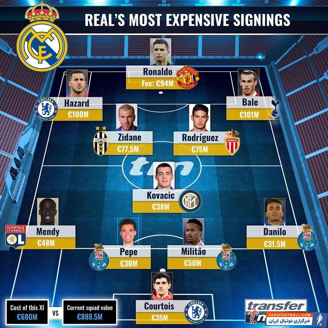وب سایت معتبر ترنسفرمارکت در اقدامی جالب اقدام به انتشار ترکیب ۱۱ نفره منتخب گران قیمت ترین خریدهای باشگاه پرطرفدار رئال مادرید کرده است.