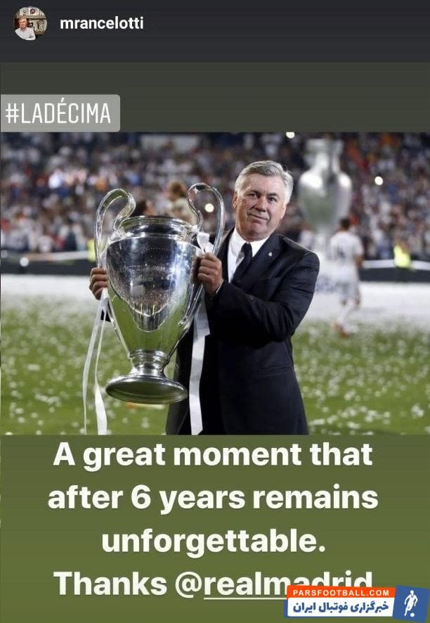 کارلو آنچلوتی که این روزها سرمربی اورتون است با انتشار استوری در اینستاگرام نشان داد هنوز هم یاد قهرمانی دهم رئالمادرید در لیگ قهرمانان اروپا است.