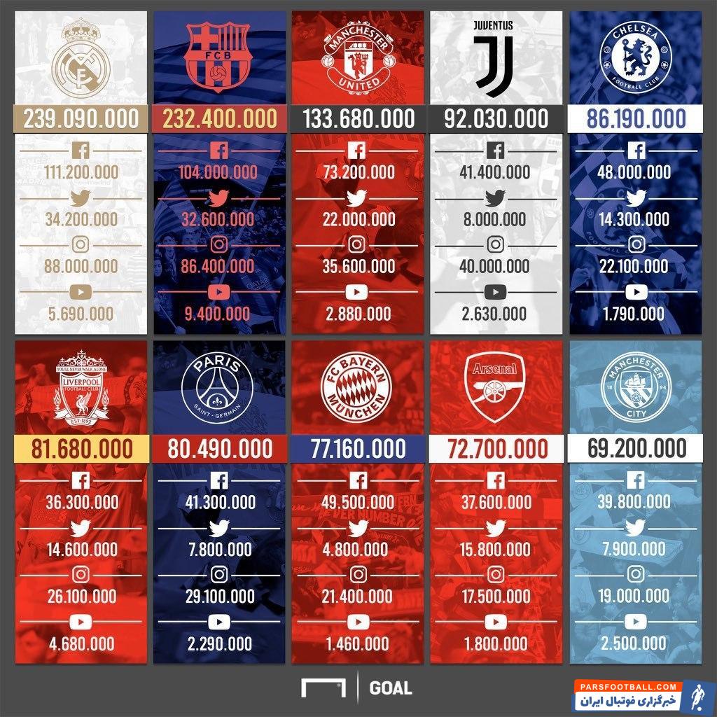 به نقل از وبسایت گل، رده بندی باشگاه های بزرگ اروپایی در شبکه های مختلف اجتماعی از نظر تعداد دنبال کننده به شرح تصویر زیر است. (فیس بوک، اینستاگرام، توئیتر و یوتیوب) در این رده بندی رئال مادرید ، بارسلونا و منچستریونایتد در رتبه های اول تا سوم هستند: