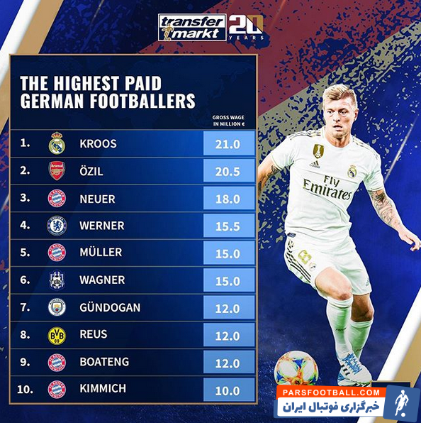 به نقل از ترنسفرمارکت، تونی کروس ستاره آلمانی رئال مادرید با دستمزد سالانه ۲۱ میلیون یورو، بیشترین حقوق را در بین بازیکنان آلمانی دنیای فوتبال می گیرد، پس از او مسوت اوزیل و مانوئل نویر به ترتیب با ۲۰.۵ و ۱۸ میلیون یورو در رده های بعدی هستند: