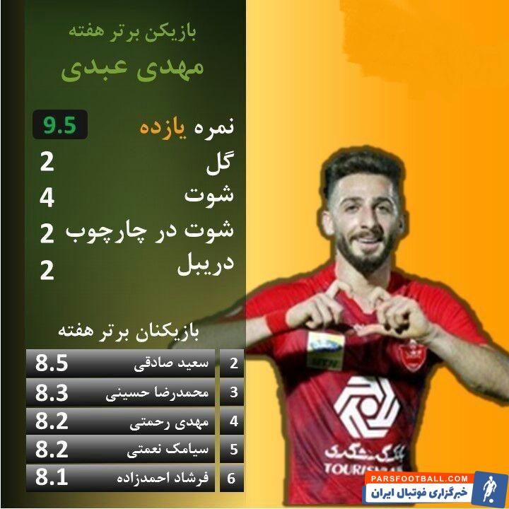 مهدی عبدی ستاره خط حمله تیم پرسپولیس که یک ساعت در دیدار با پیکان فرصت بازی داشت، به عنوان بهترین بازیکن این هفته لیگ برتر فوتبال ایران معرفی شد. مهدی عبدی نمره ۹.۵ را گرفت و با دو گل، ۴ شوت که دو تا در چارچوب بودند و همچنین دو دریبل موفق، بالاتر از دیگر بازیکنان قرار گرفت. او همچنین فرصت این را داشت که با پاس گل، نمره بهتری را هم کسب کند که کمی بی دقت و بدشانس بود.