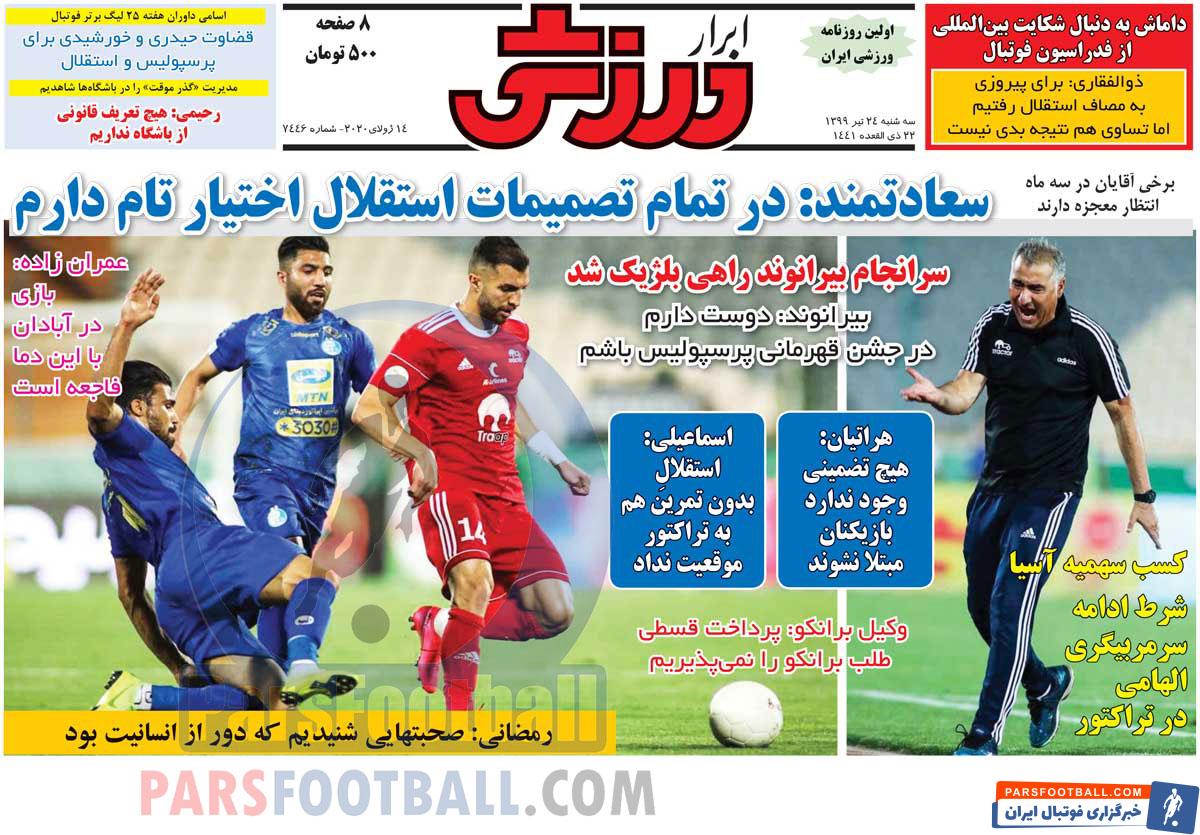 عناوین روزنامه ابرار ورزشی سه شنبه ۲۴ تیر ماه به شرح زیر است :