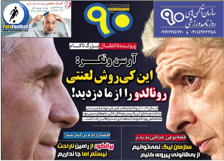 مروری داریم بر عناوین روزنامه نود چهارشنبه ۱۳ مرداد ۹۵. عناوینی همچون : آرسن ونگر : این کی روش لعنتی رونالدو را از ما دزدید! ، برانکو : از رامین ناراحت نیستم اما جا نداریم! ، قلعه نویی : عدالتی ندیدم ، افشارزاده برکنار شد