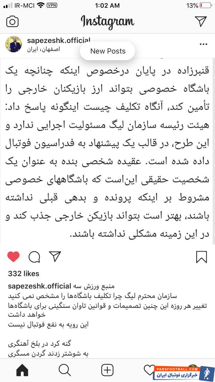 علی پزشک در تازه ترین واکنش نسبت به منع جذب بازیکن و مربی خارجی در صفحه مجازی خود پس از اشاره به حرف های قنبرزاده، اینطور نوشته است: