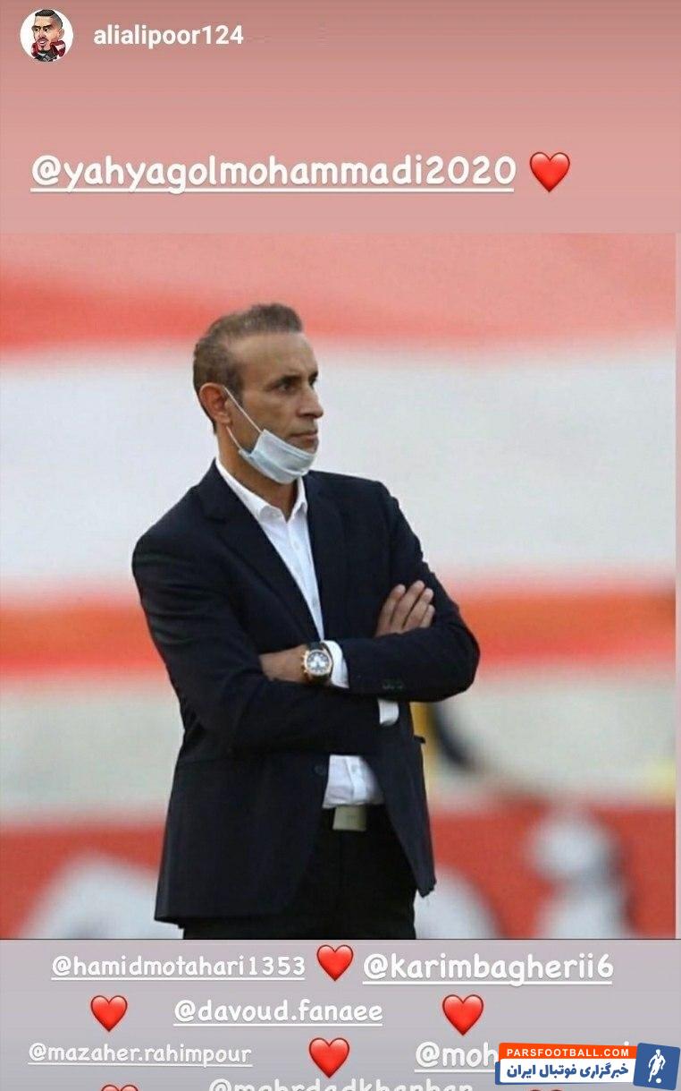 علی علیپور مهاجم سرخپوشان پرسپولیس که در دربی هم گلزنی کرد، با انتشار این پست از یحیی گلمحمدی و کادرش حمایت کرد.