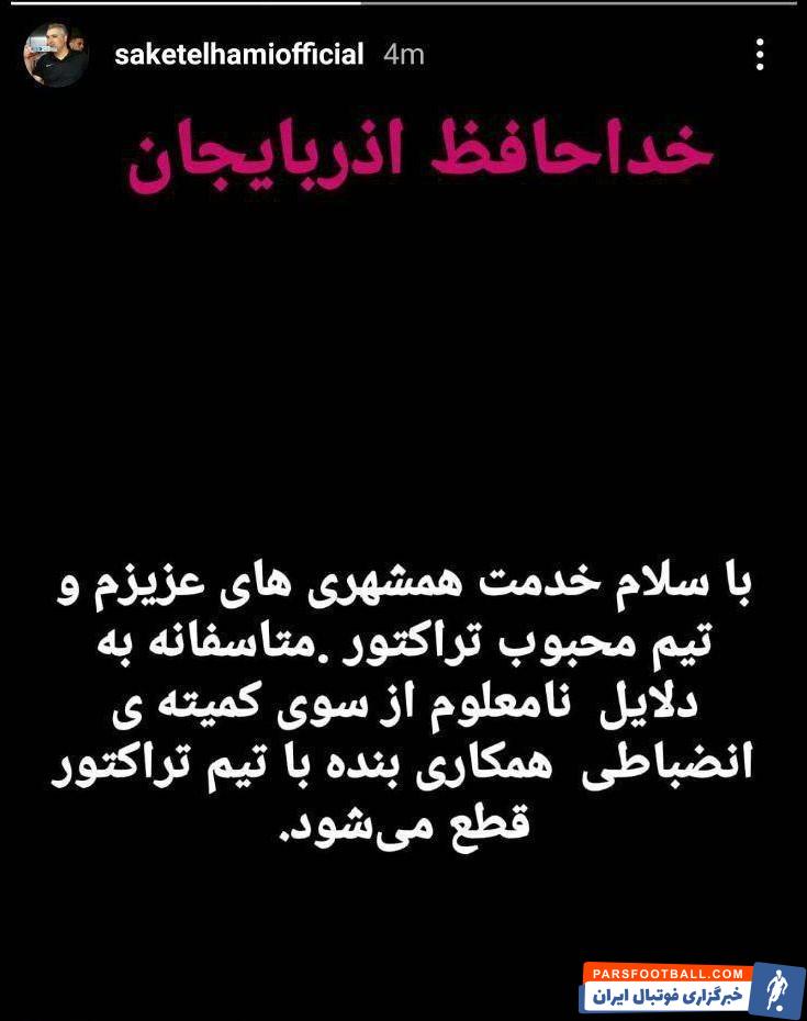 ساکت الهامی با انتشار پیامی از هواداران تراکتور خداحافظی کرد